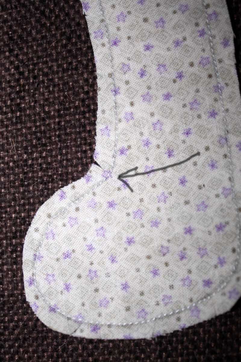 В конце шитья добавляются пломбы, чтобы убедиться, что ножка имеет правильную форму. После то же самое проделывается с другой ногой.Затем плюшевые ножки сшиваются той же строчкой. Прежде чем закончить шитье, также надо положить внутрь начинку.