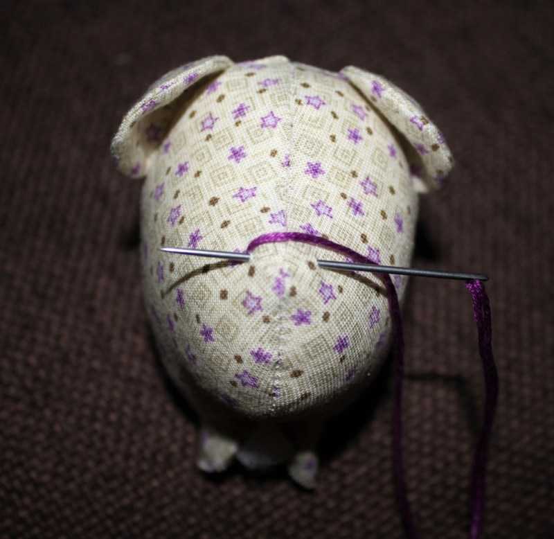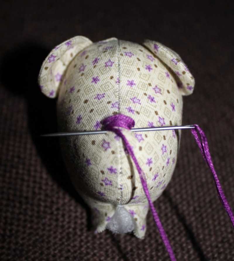 Дело в том, что центр верхней части морды (там есть такая бороздка) точно совпадает с осевой линией головы. Поэтому сшиваются сначала эти две точки. Теперь линия шва шеи должна совпадать со средней точкой в нижней части морды. Эти две точки также прошиваются, и еще один сантиметр сбоку.