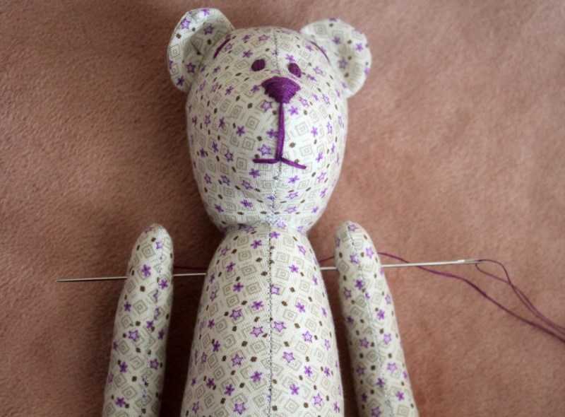 После голова ставится на свое место. Потому что теперь вы едва видите, где эта шея: лучше начать с невидимого места в туловище, а после потянуть нить в какое-то место в головке плюшевого мишки, направляя иглу изнутри наружу. Ее стоит затянуть так, чтобы голова и туловище плотно прилегали друг к другу.