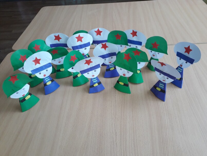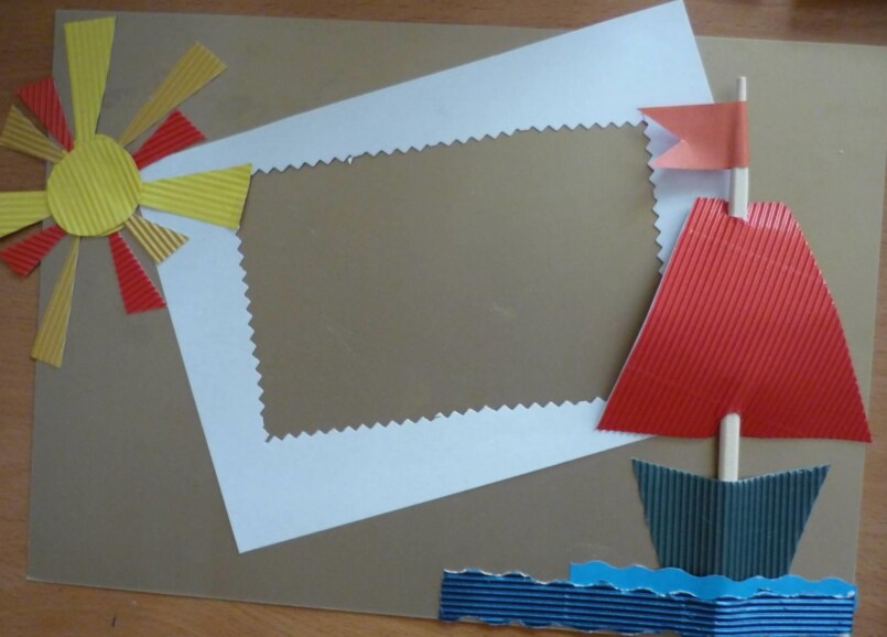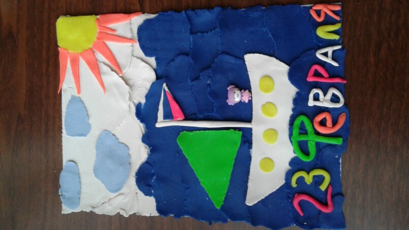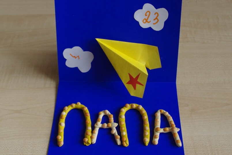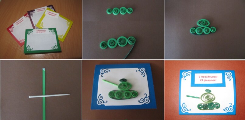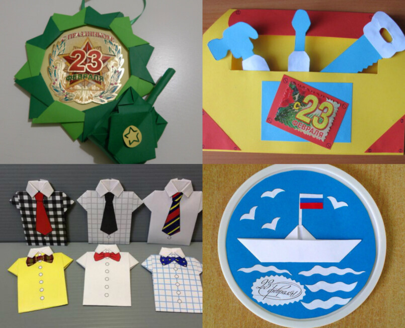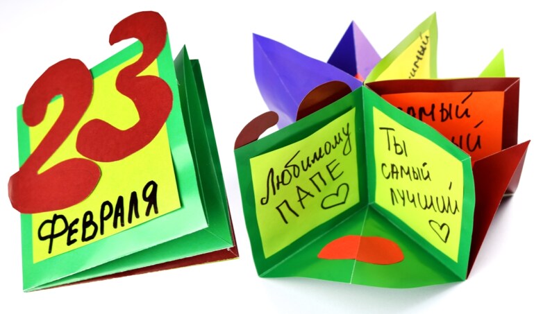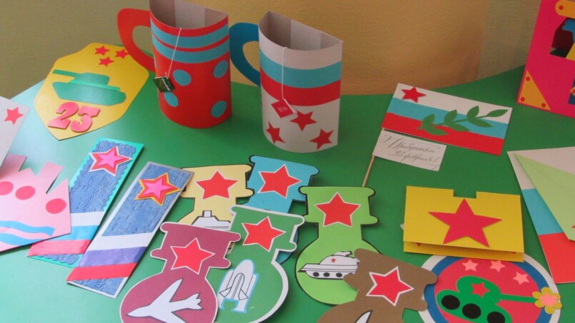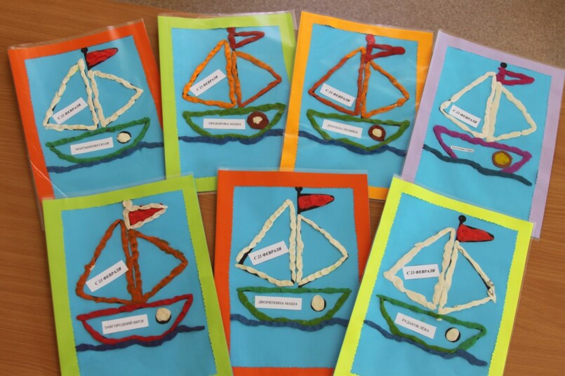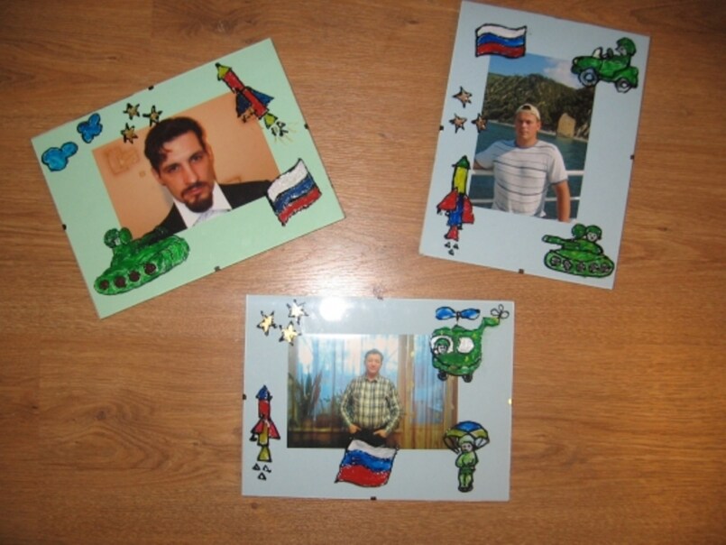 Цветные карандаши плотно приклеивают к белой рамке. Клеевой пистолет прекрасно справится с этой задачей. Далее нужно смастерить бумажный кораблик и приклеить его к рамке, а непосредственно на открытке нарисовать или распечатать тематический рисунок. Это могут быть гладиаторы, солдаты и другие известные персонажи. Открытка папе на 23 февраля готова!