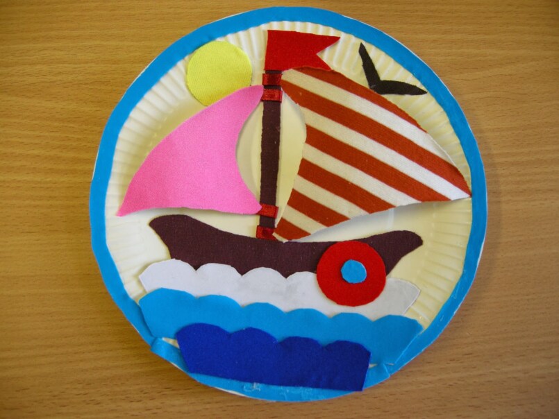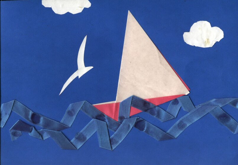 В сгиб вставляется деревянная шпажка, кончик которой необходимо сформировать так, чтобы он примерно на один сантиметр выступал над парусом. После этого сделанная конструкция склеивается канцелярским клеем.