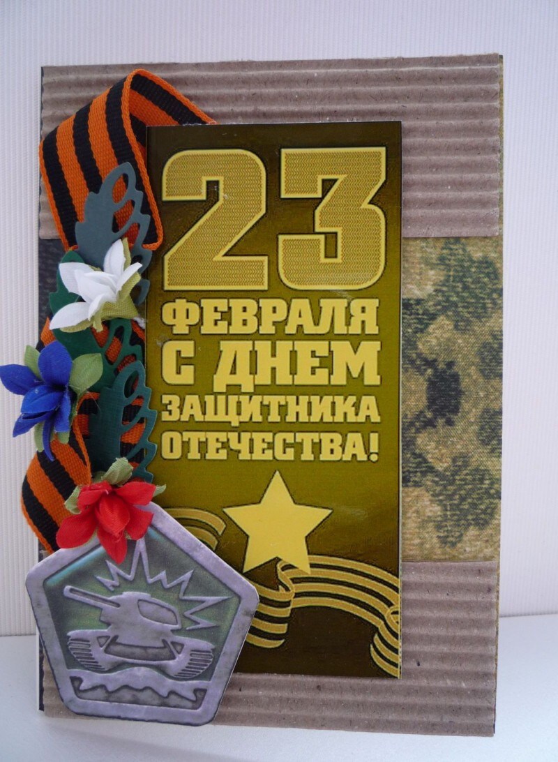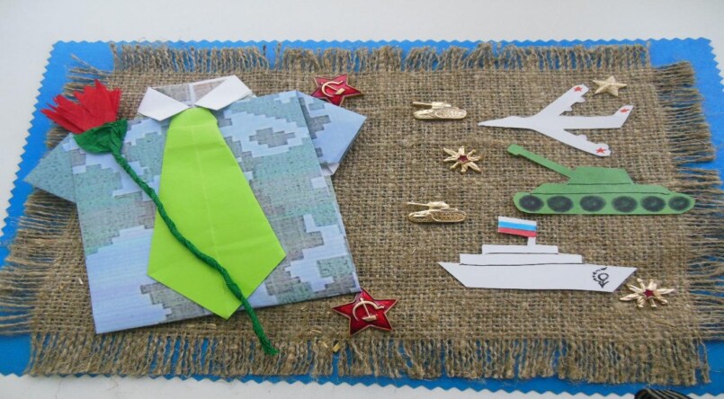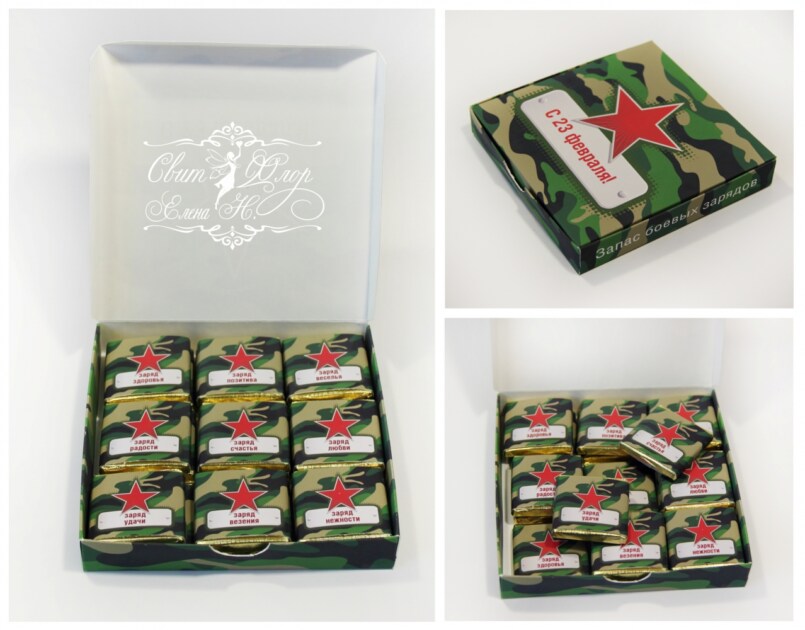 Коробка должна быть прямоугольной формы. Если она не очень крепкая, можно ее укрепить, обклеив по бокам плотным картоном, а потом бумагой с камуфляжным рисунком; сложить в нее молоток, желуди и детскую пустышку, закрыть крышкой. Чтобы подчеркнуть торжественность момента, нужно перевязать подарок атласной ленточкой. Подарок на День защитника Отечества готов.