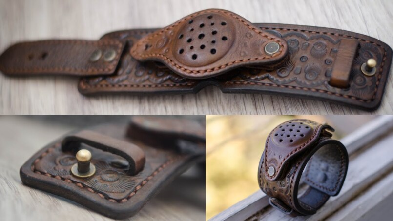 Изготовление такого презента потребует от исполнителя максимальной усидчивости и внимательности. Для работы понадобятся веревки из кожи, ножницы и оригинальная застежка для крепления ремешков.