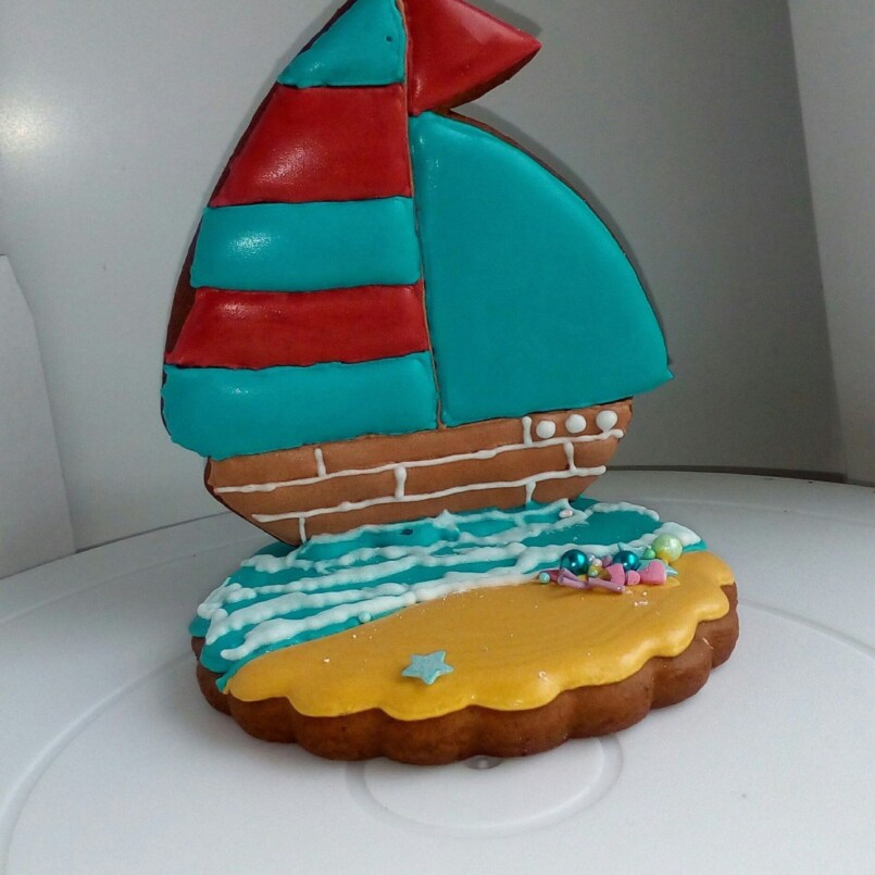 Сначала формируется парус для корабля из шоколада. Нужно из цветной бумаги вырезать треугольник с основанием, равным 12 сантиметрам и боковым сторонам по 10 сантиметров. Далее треугольник складывается вдвое.
