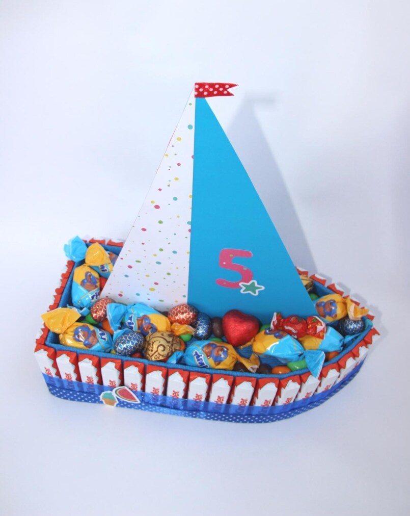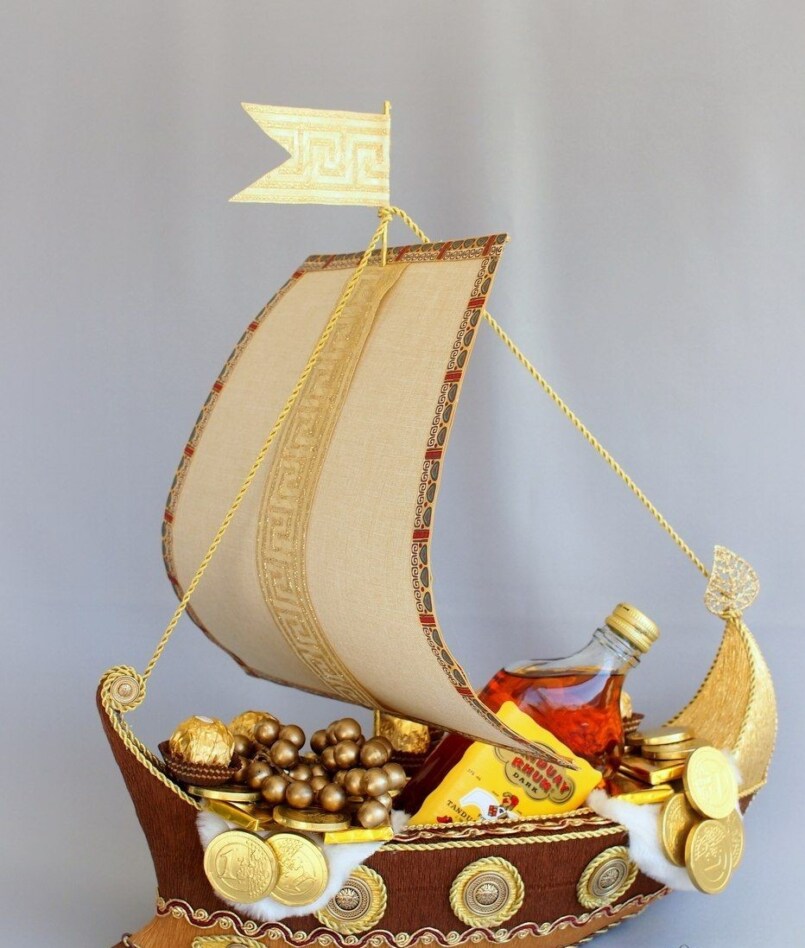 Если мужчина сладкоежка, такой подарок он оценит по достоинству. Времени на изготовление кораблика уходит минут двадцать.