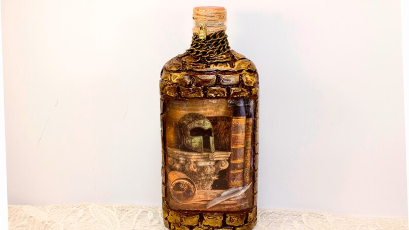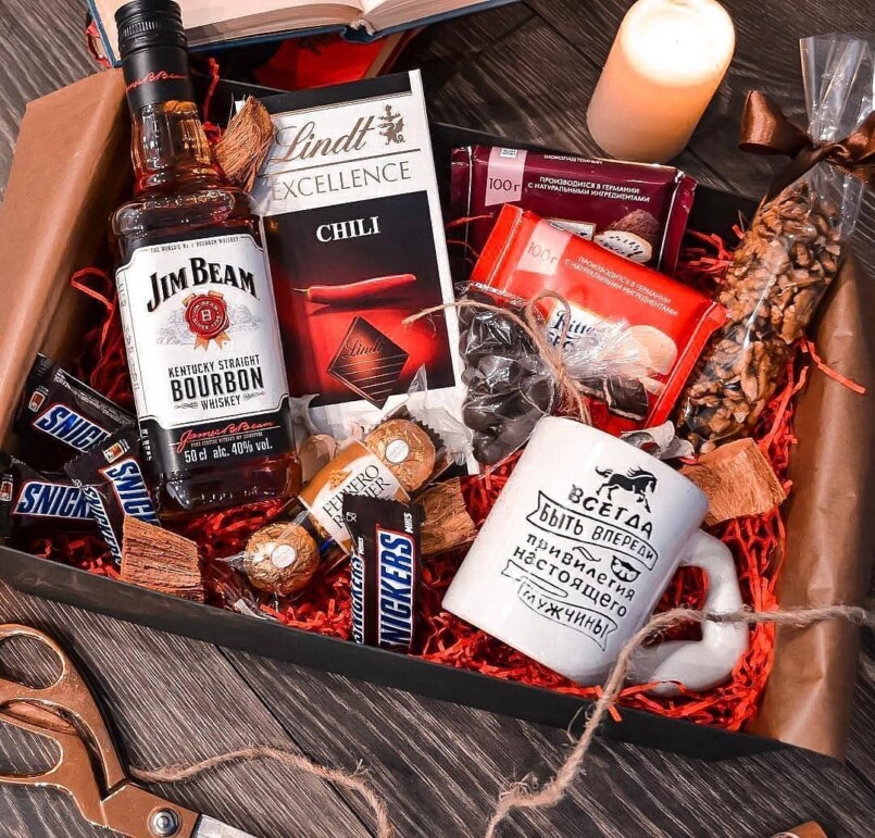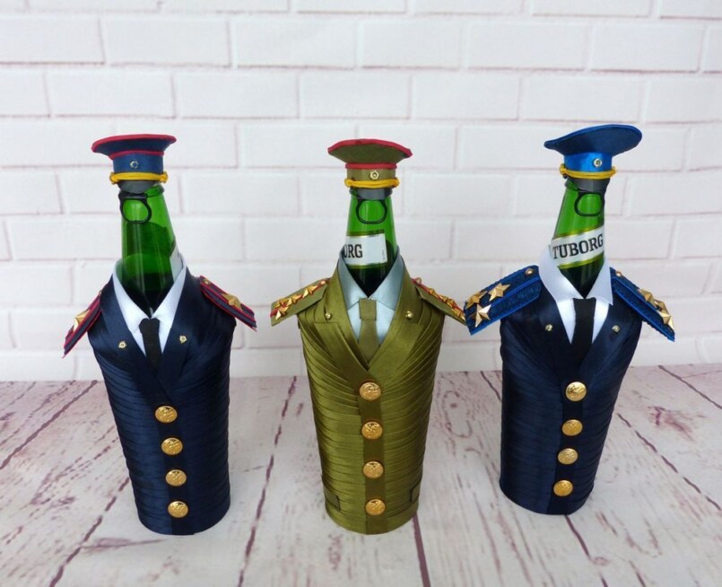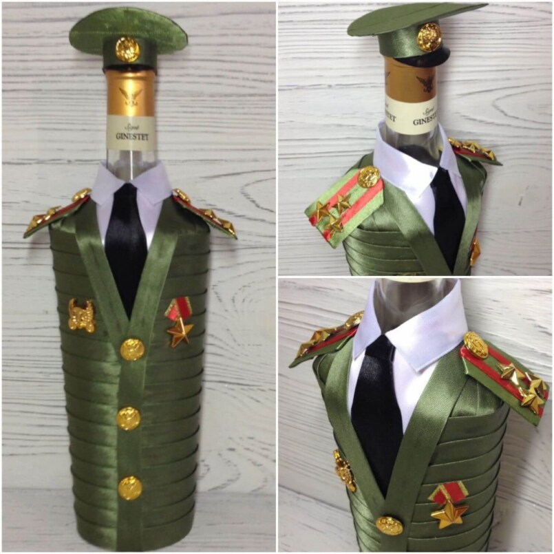 Бутылочку хорошего алкоголя в качестве подарка на мужской праздник с удовольствием примет каждый представитель сильного пола. А если бутылку ещё и тематически украсить, это ещё больше впечатлит мужчину.