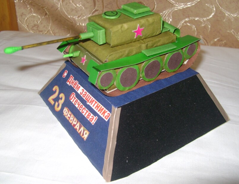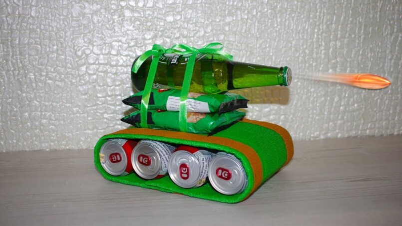 Существует масса вариантов для приготовления подарочной военной техники своими руками. Но одним из самых интересных является приготовление танка из сладостей и бутылки с пивом. Сначала следует смастерить макет военной техники своими руками.