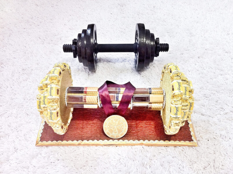 Шоколадные батончики надо приклеить к основе гантели и обмотать края ручки, которые выступают за дисками, скотчем и зафиксировать начальный шоколадный ряд. Затем обматывают двухсторонним скотчем и крепят еще батончики, чтобы замаскировать пустоты. Таким образом, гантель станет круглой формы. Рядов может быть от 2-х до 4-х. Если под рукой нет двухстороннего скотча, в качестве альтернативы можно использовать канцелярский клей. Если на атласную ленту подвесить шоколадную медальку, то получится дополнение к изготовленному подарку.