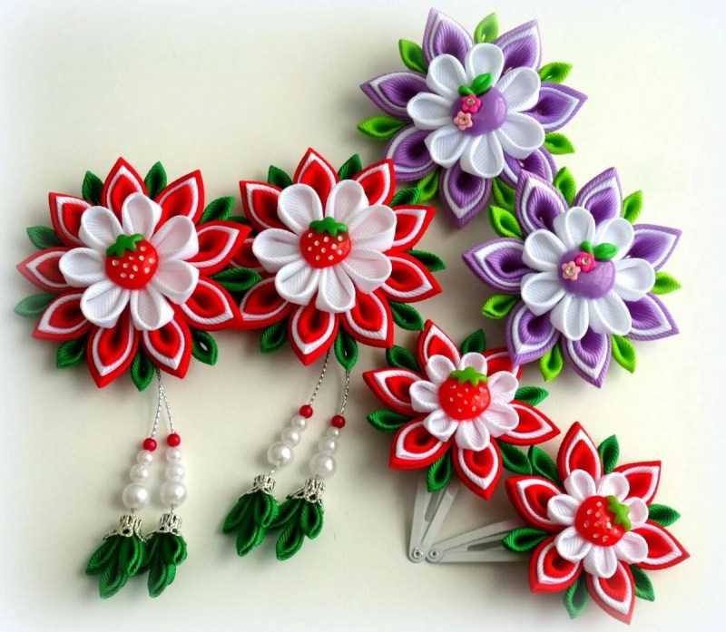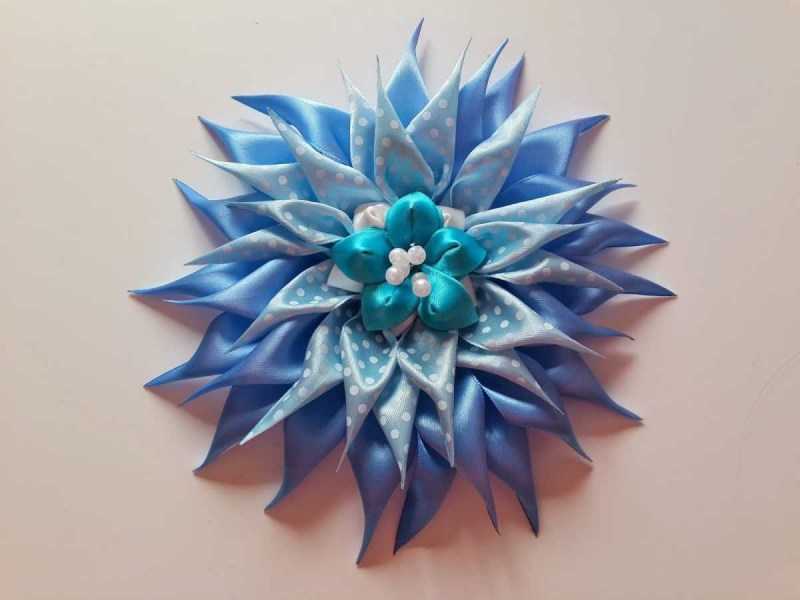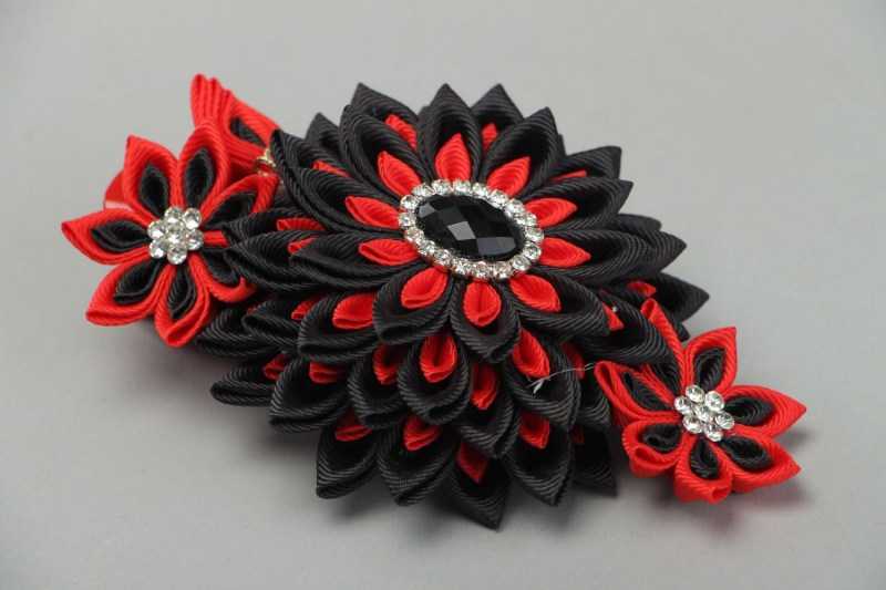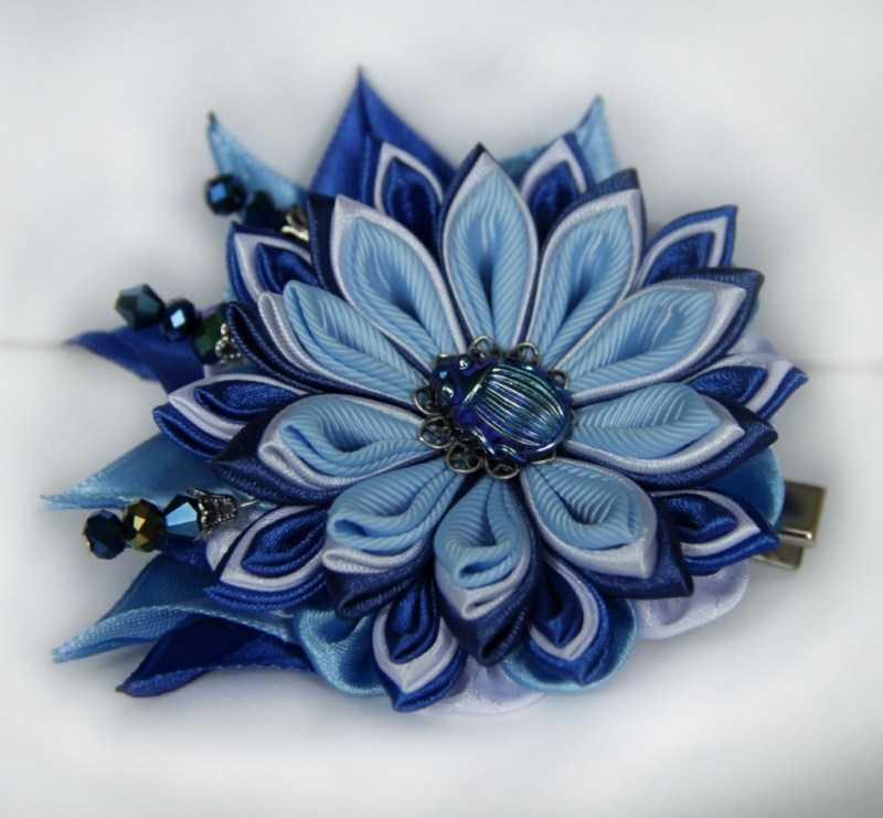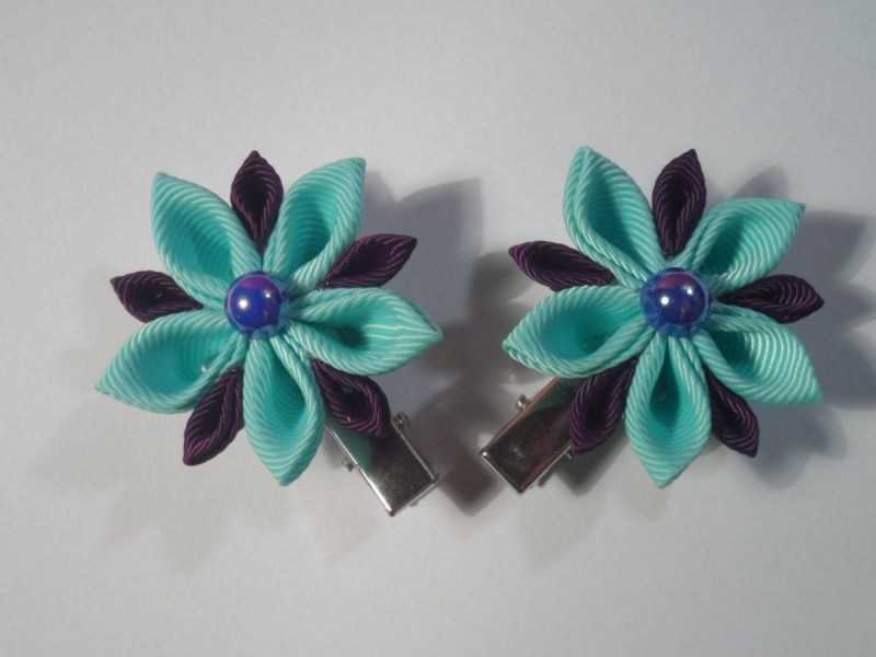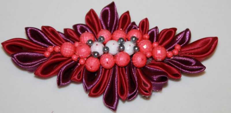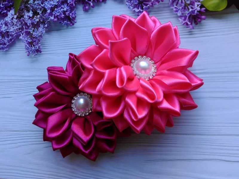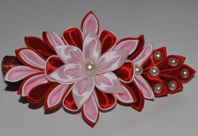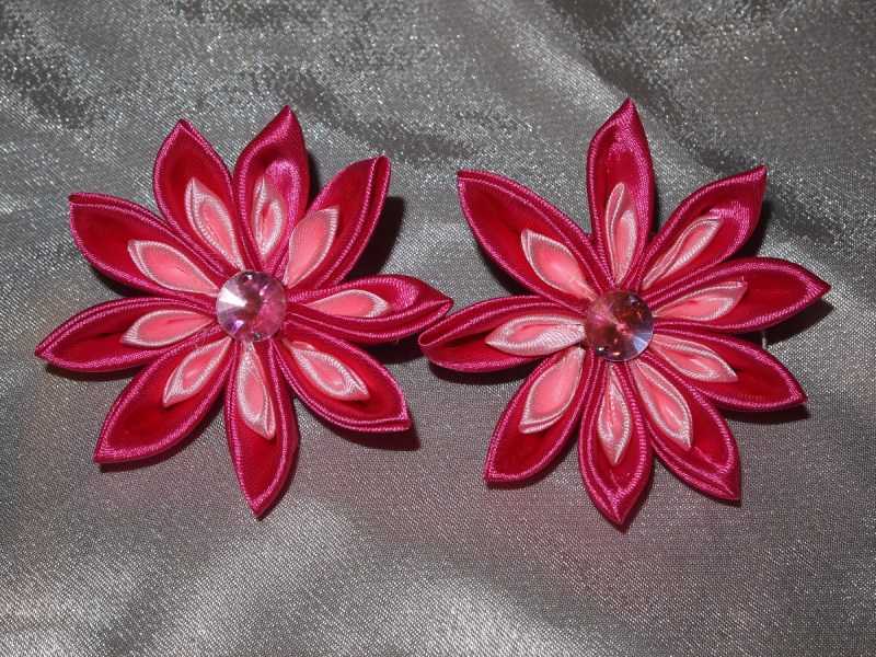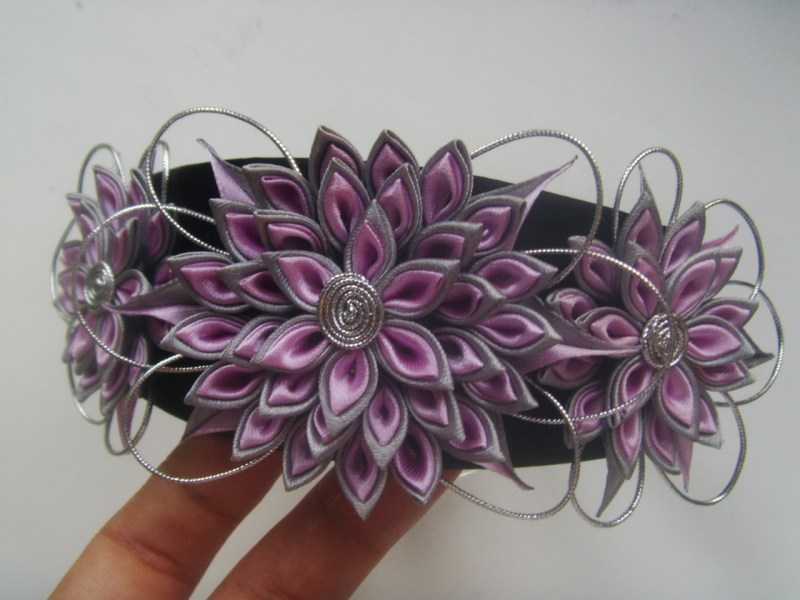 Но не редко выбор падает на яркие цветы в стиле канзаши. Среди цветов из канзаши можно прилепить ленты или большие бусины на тоненькой серебряной проволочке.