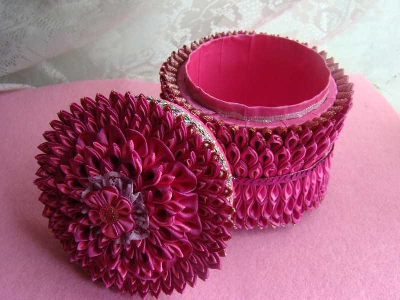Самый лучший вариант — это нарисовать разноцветные узоры и приклеить к крышечке цветочек канзаши. Таким же образом приклеить по бокам несколько одинаковых цветов и добавить немного бусин или бисера. Шкатулка приобретет совсем иной вид и станет только красивее.
