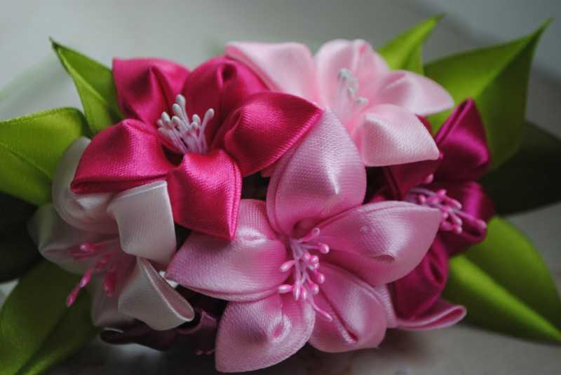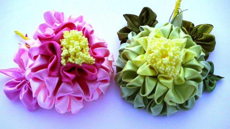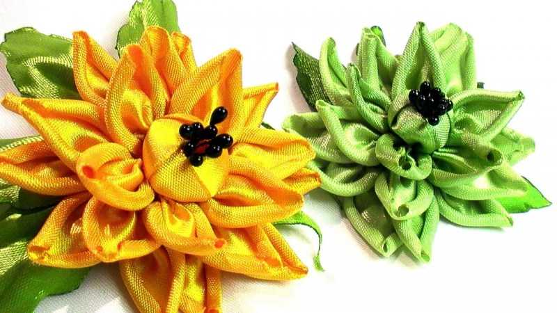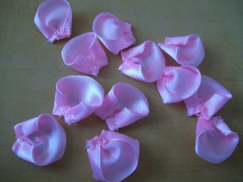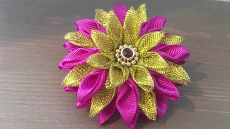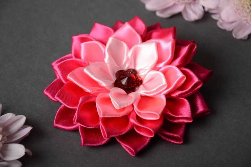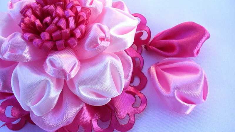 Одними из самых простых вариантов считаются цветки с круглыми лепестками. Если лепестки накладывать друг на друга, можно добиться максимально результата объемного цветка и перерывающихся оттенков. Сложней идут цветки с острыми лепестками. Техника совмещает разные ленты воедино.