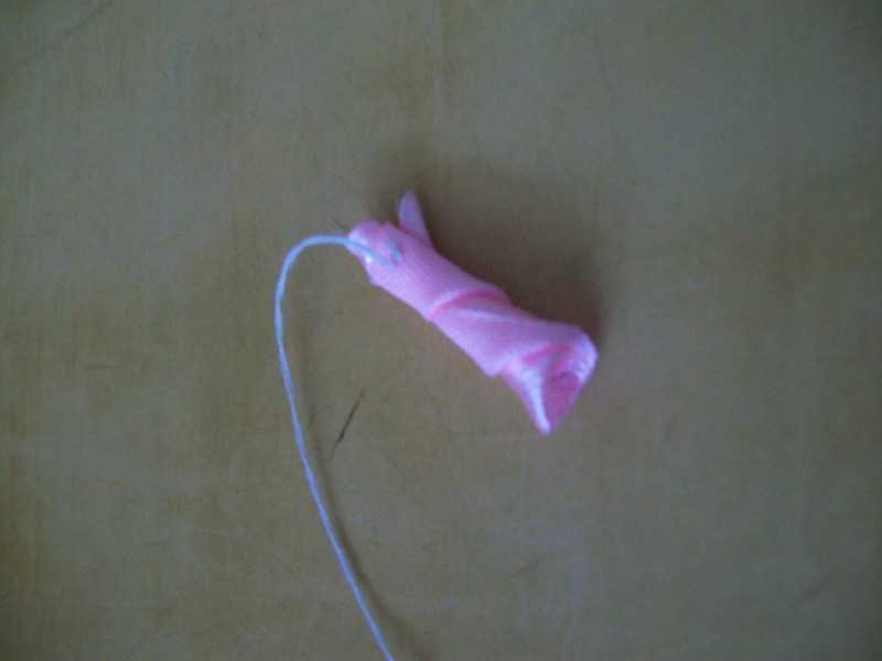 После нужно вывернуть лепесток так, чтобы сшитые концы оказались на середине. По горизонтали обрезаем нижнюю часть лепестка и запаиваем оба конца вместе. Технология на один лепесток готова.