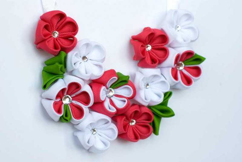 Немало представительниц женского пола предпочитают создавать для себя украшение в технике канзаши на шею, прикрепляя на цепочки или бусы небольшие цветочки и добавляя пару бабочек. Получается прекрасное ожерелье своими руками.