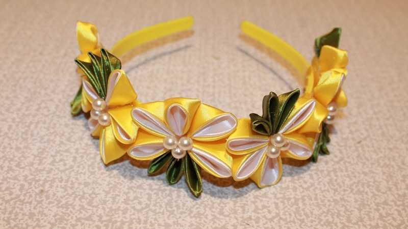 Так же отлично смотрятся цветы канзаши на обруче для волос, особенно если они расположены по вдоль всего обруча от маленького к большому.