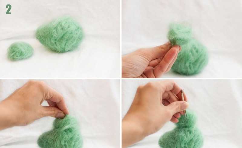 Берутся несколько комочков шерсти диаметром пять сантиметров, из которых формируются шарики, после чего начинается валяние при помощи иглы. Затем шары смачиваются водой, на них наносится мыло и после этого их начинают катать руками до тех пор, пока они не станут твердыми.