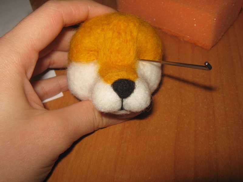 Из белой шерсти сворачивается рулон, а на губке формируется нужная форма, которая должна быть похожа на яйцо. Далее к туловищу крепиться шея, а затем голова. В той же технике делаются ушки и четыре лапки.