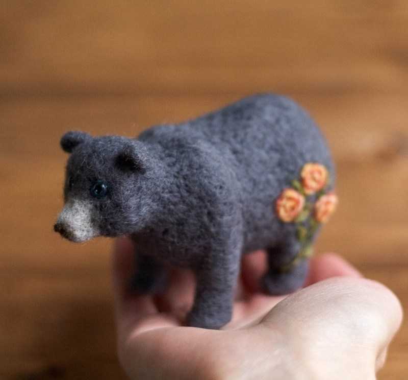 Черный носик крепится к мордочке, а к лапкам розовые пяточки. Мишка готов. Такие мягки игрушки простые в исполнении будут хорошим началом в технике валяние из шерсти для начинающих.